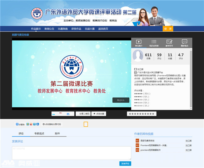 廣外深知微課大賽會涉及多項繁雜的步驟工作,并找到知名錄播廠家奧威亞。針對廣外的實際情況,奧威亞在應(yīng)用平臺上專門設(shè)計打造了微課比賽活動的欄目,將傳統(tǒng)的評課步驟一一簡化?,F(xiàn)在,評課專家可以在線上完成所有的評課步驟,再也不用看到厚厚的紙質(zhì)評價表了~